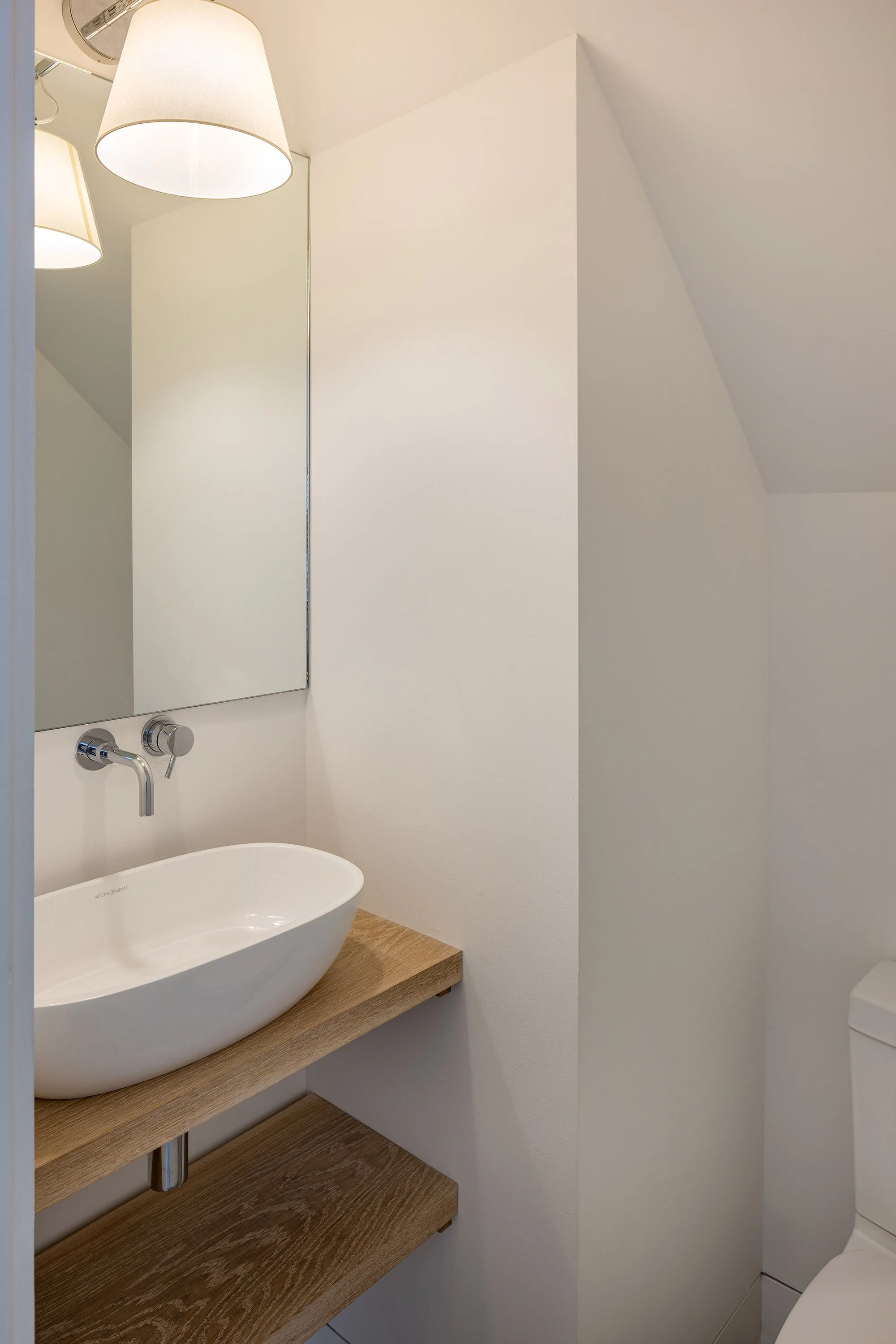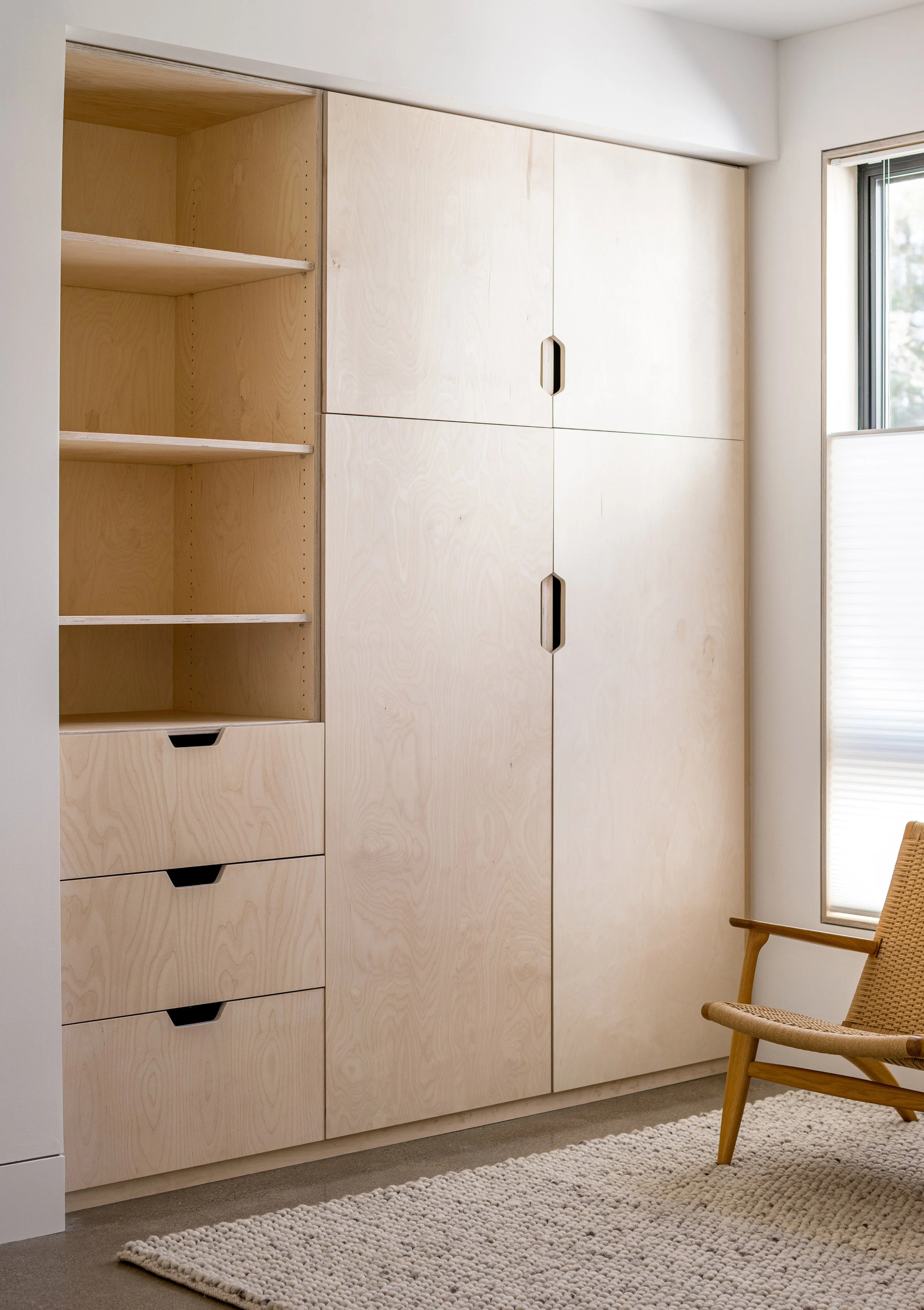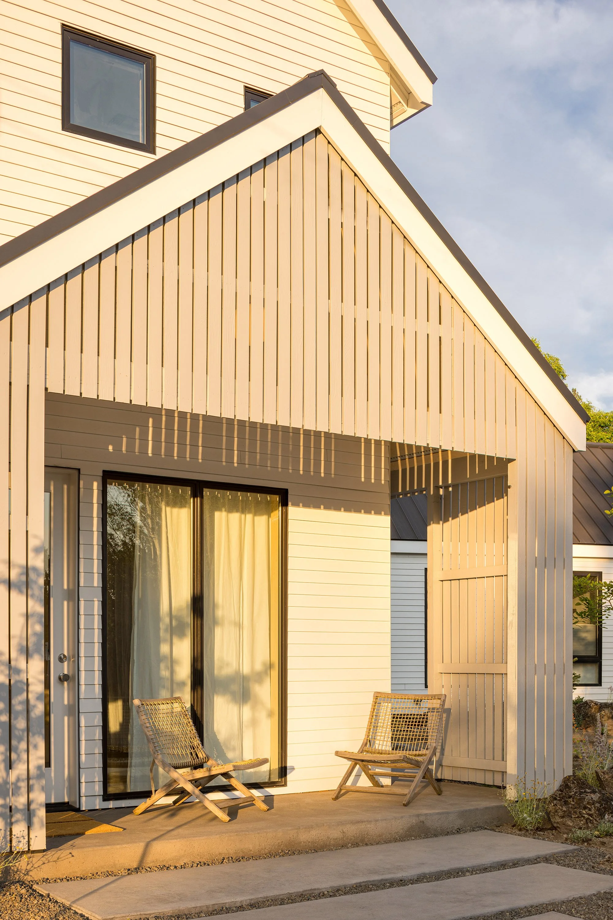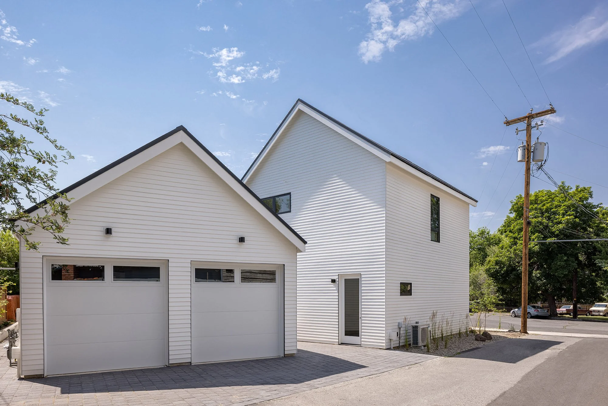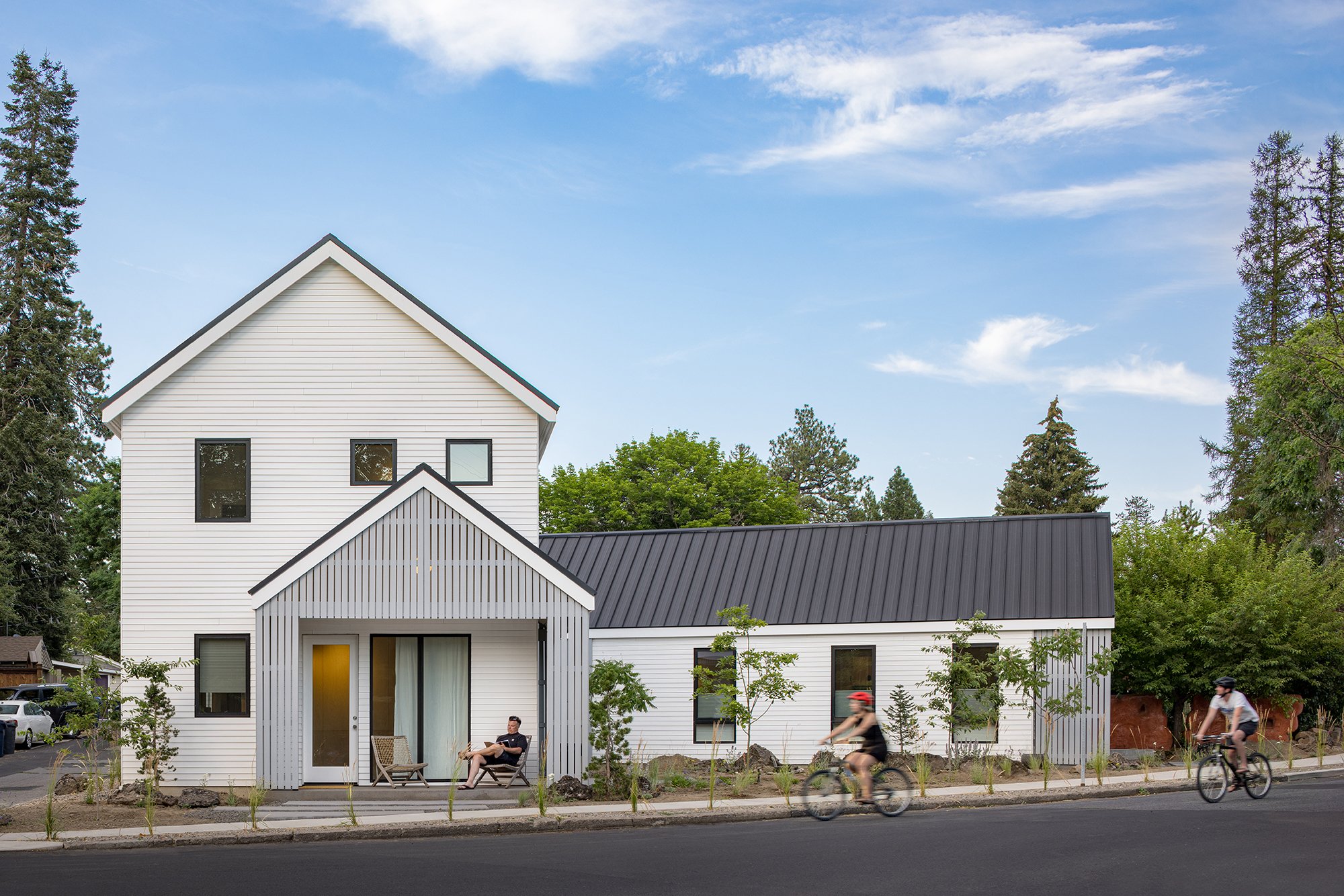 Formerly a wedge-shaped parking lot, our Bend infill project is composed of two complementary structures, designed to accommodate two households. Each home lives independently with the opportunity for multi-generational living and communal outdoor space.