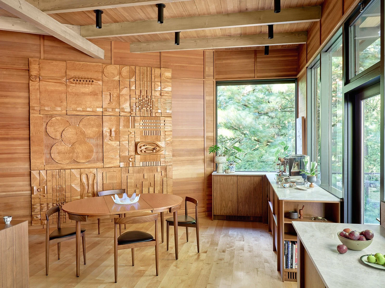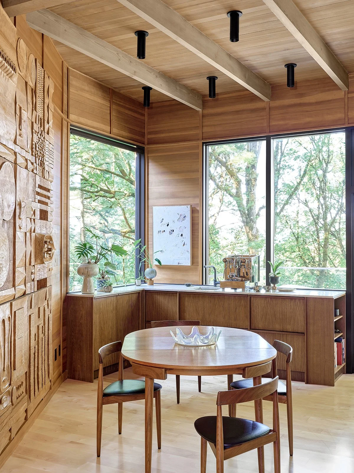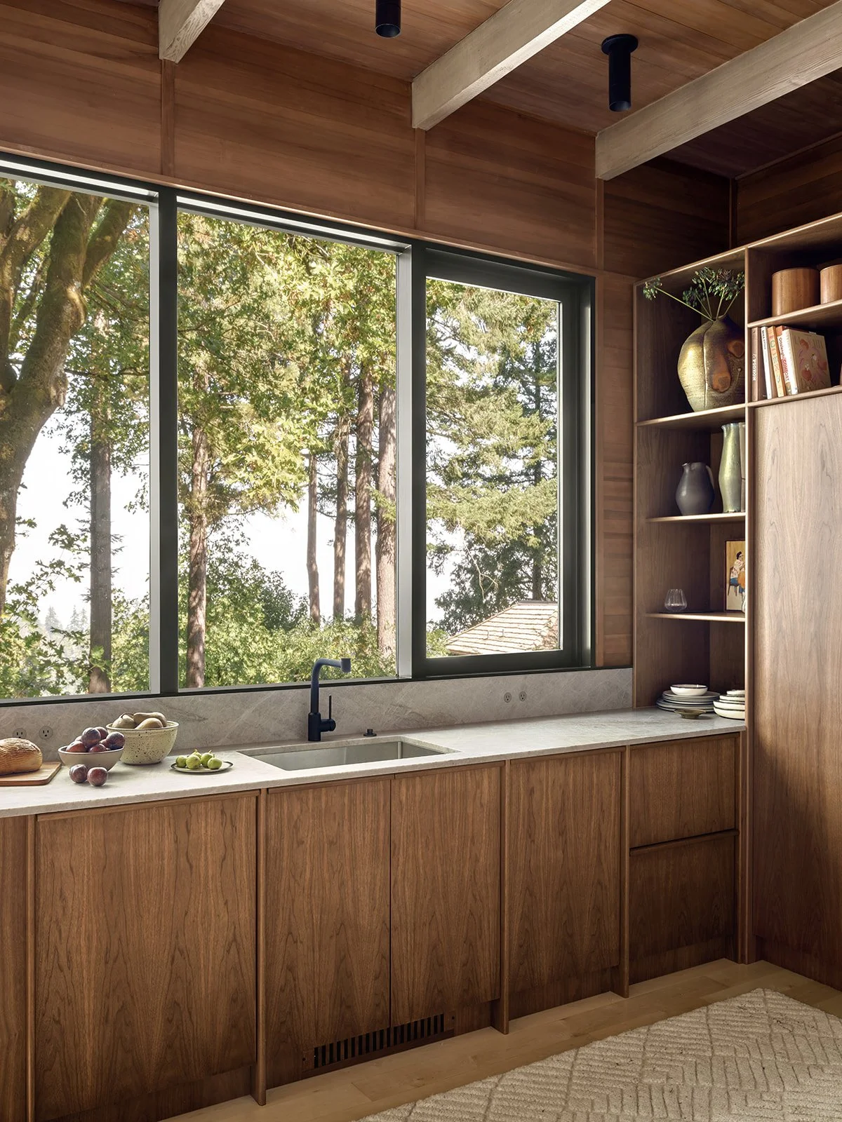 The 1961 structure is clad entirely in a mix of Cedar, Fir, and Maple. The new cabinetry, with a custom stile detail developed by Mark Newman, is custom-stained Walnut, which acts as a bridge between the collection of species.