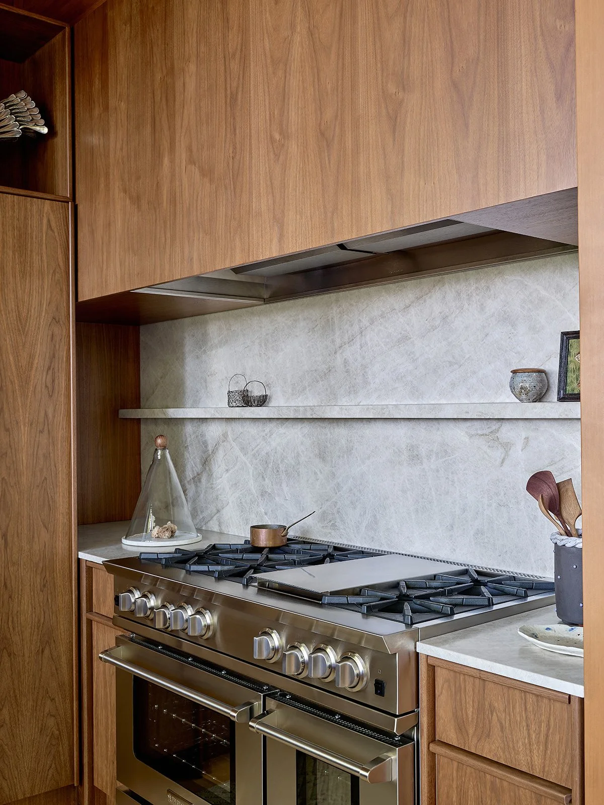 A 48” range is hugged by natural stone and a Walnut-clad custom range shroud