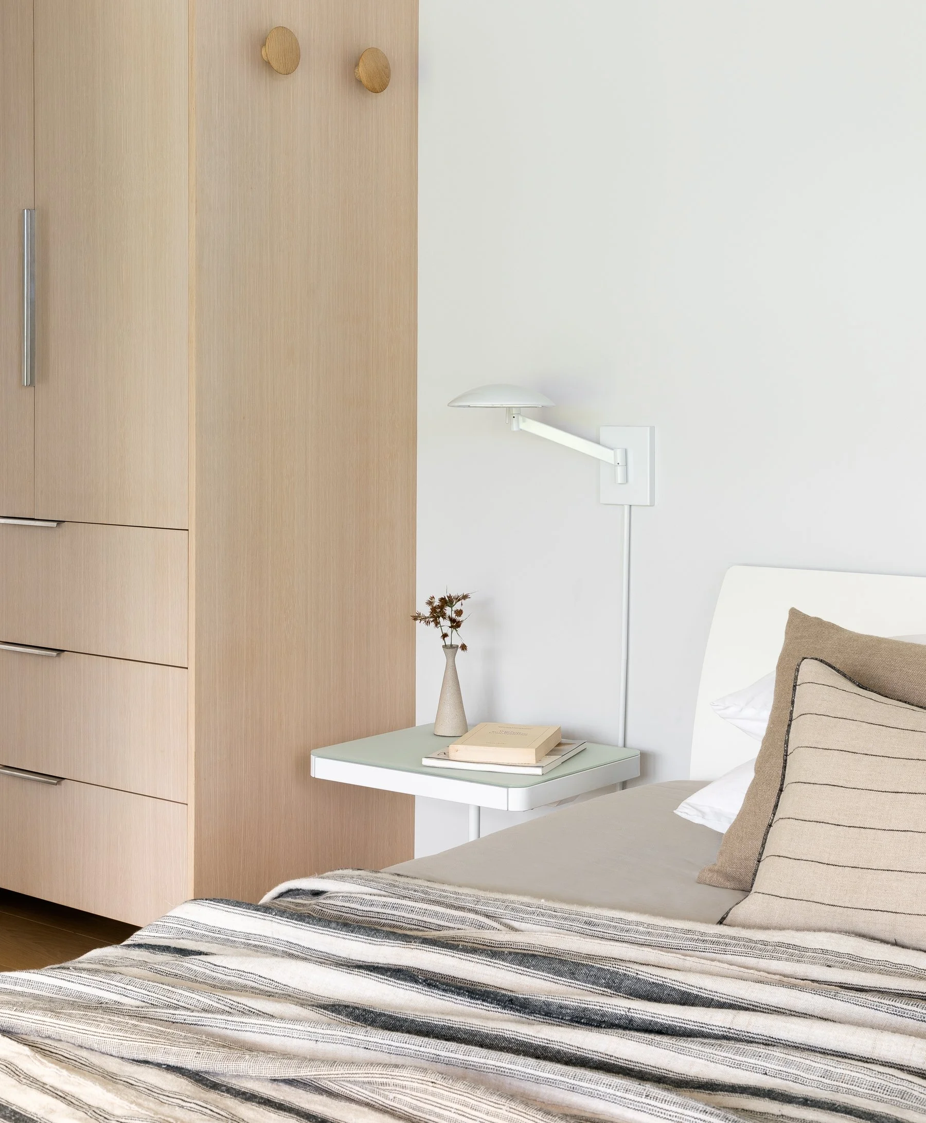 Rather than a traditional closet, we designed a dual wardrobe that occupies the entry to the cottage. The space saving feature adds a rich layer to the sleeping room experience.