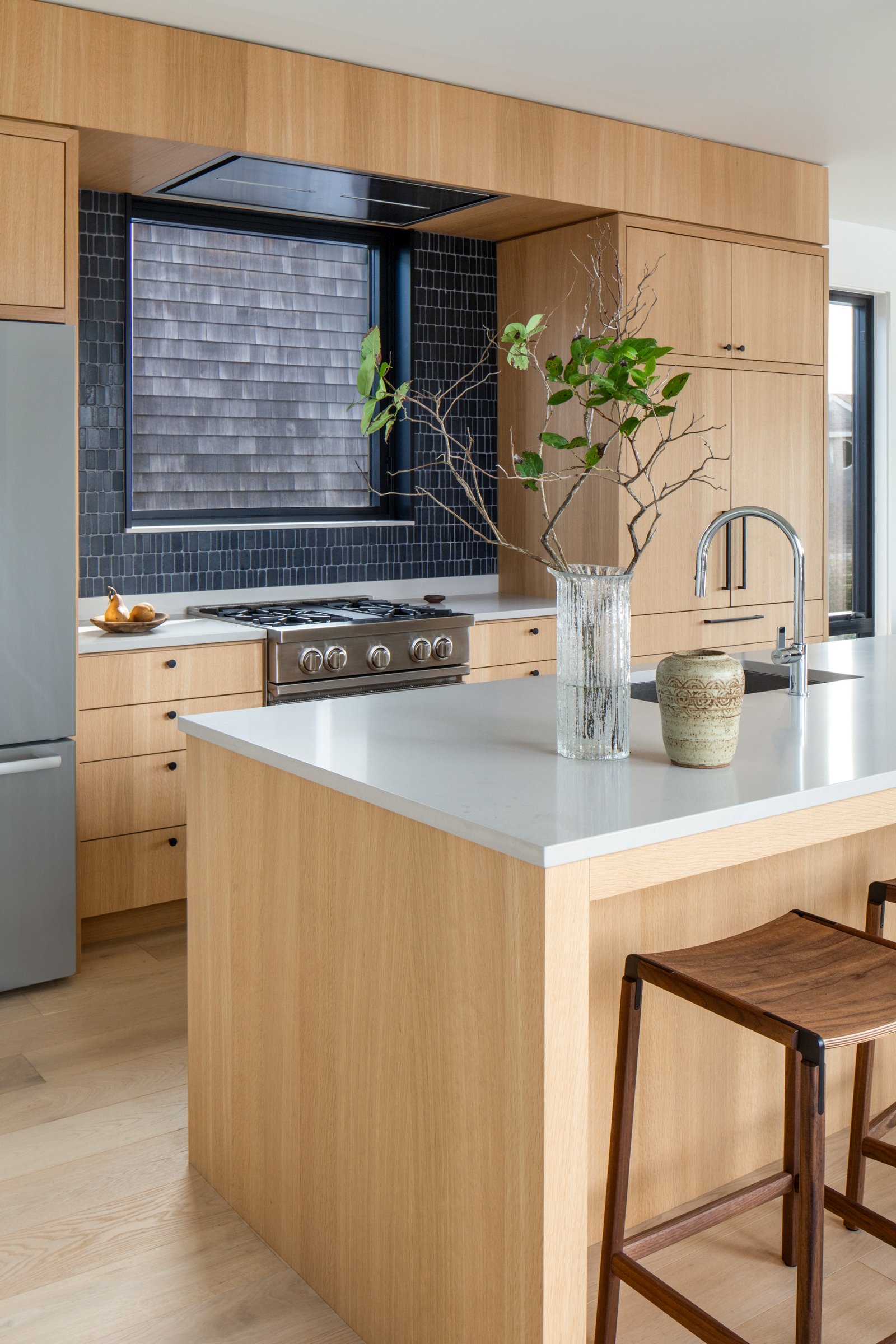 The interior finish palette of white oak, walnut, and natural tumbled marble compliment the connection to exterior Japanese cedar.