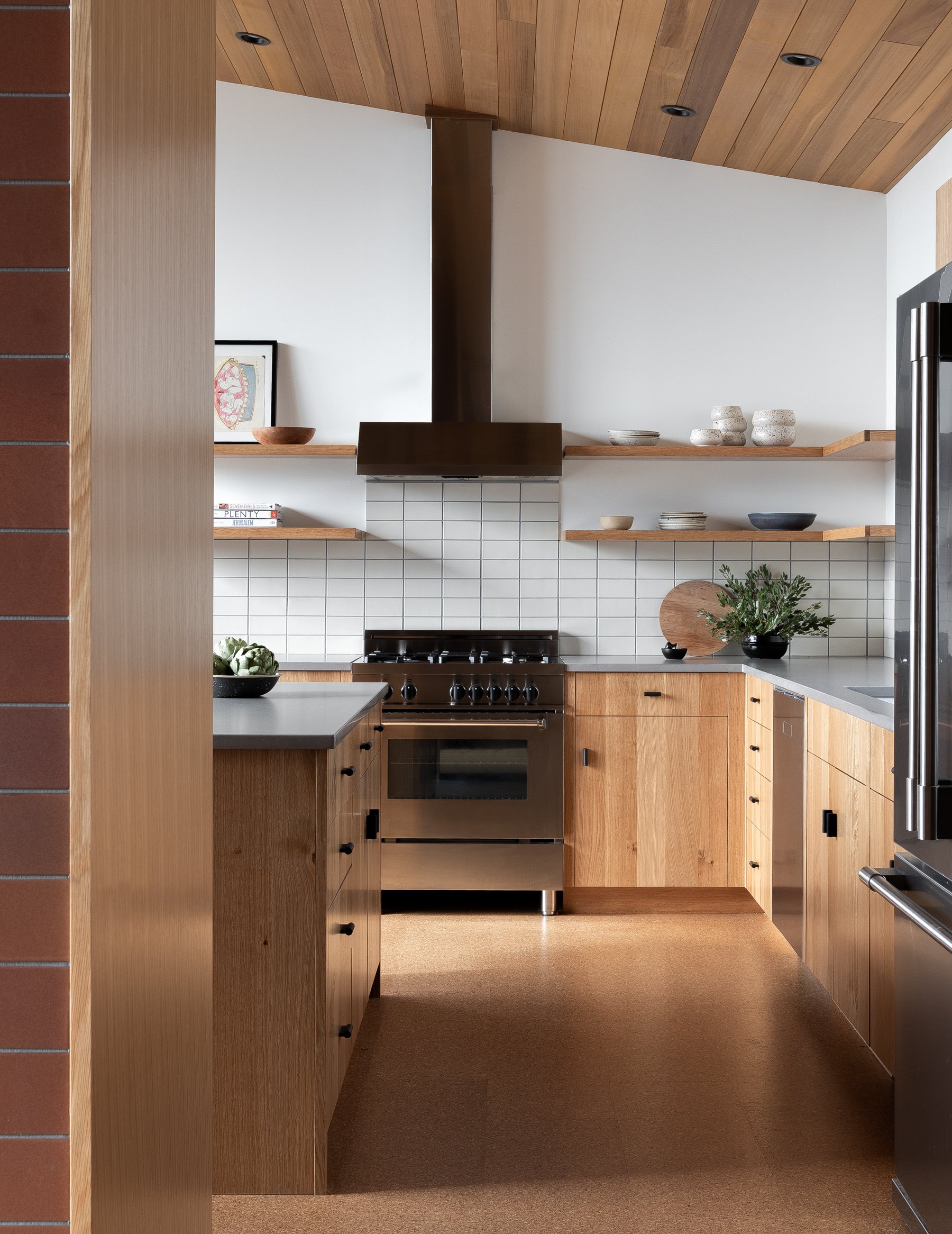 “The white oak cabinets and cork flooring pair with handmade white ceramic tile for a soothing palette that the Guggenheim studio created to reflect the natural Pacific Northwest atmosphere.”