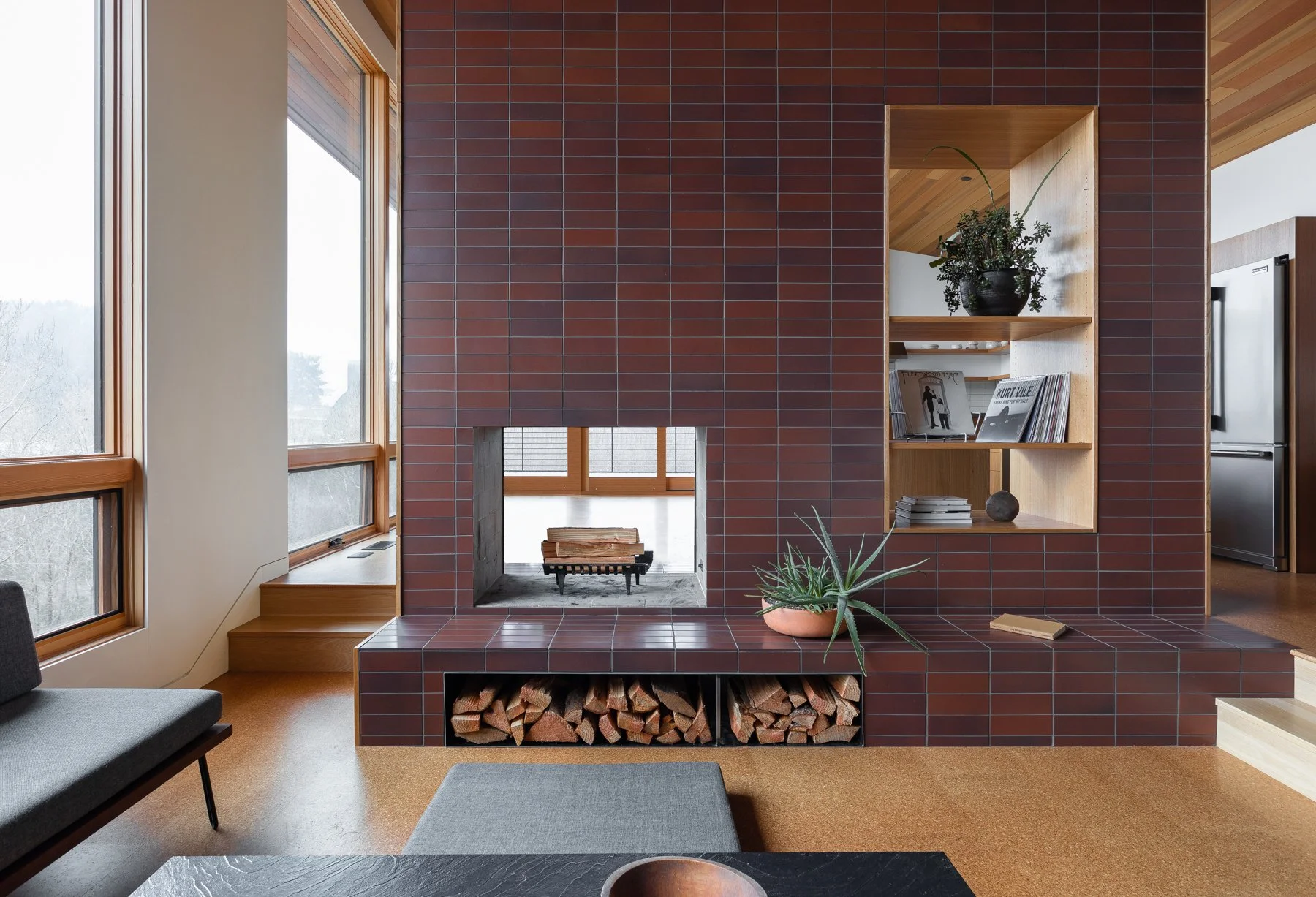 Inside, one of the biggest eye-catcher is the dual fireplace, dividing the living room and kitchen while also tying the rooms together. The fireplace is made of handmade ceramic tiles, all sourced within 650 miles of the home.”