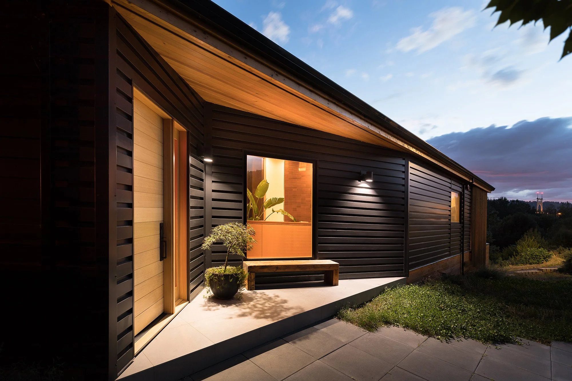 Located on a moderately steep site and former Madrona grove, this St. John's residence keeps an eye on minimalism and site-specific features. Expansive river views from the sunken living room and covered terrace are highlights in this young couple’s home.